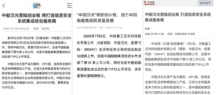 中船漢光成功上市在業(yè)內(nèi)引起強烈反響,新華社、經(jīng)濟(jì)日報以及中國證券報等主流媒體紛紛進(jìn)行了報道。