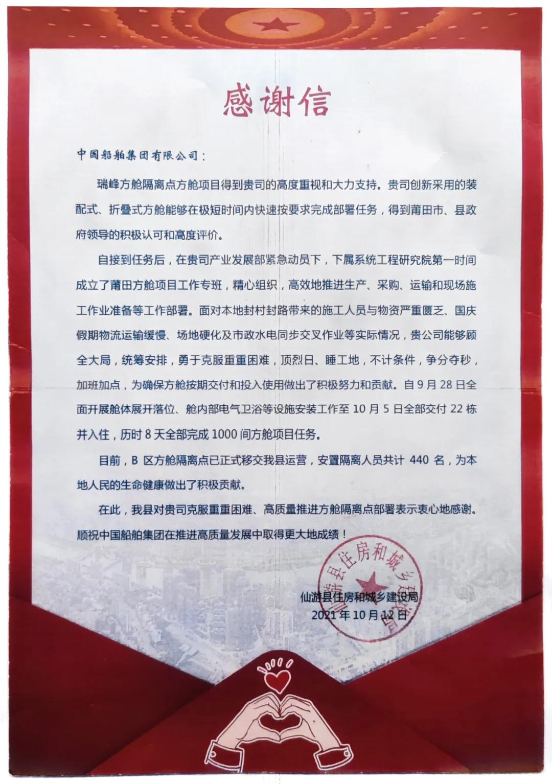 近日,中國船舶集團收到了福建省莆田市仙游縣住房和城鄉(xiāng)建設局發(fā)來的一封感謝信。