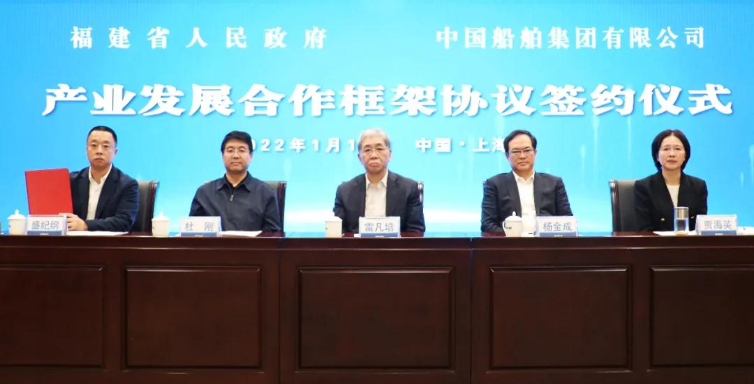 1月18日,中國船舶集團有限公司與福建省人民政府通過“云簽約”方式簽署戰略合作協議。中國船舶集團黨組書記、董事長雷凡培,黨組副書記、總經理楊金成,黨組副書記、董事杜剛,黨組成員、總會計師賈海英,黨組成員、副總經理盛紀綱;福建省委書記尹力,省委副書記、代省長趙龍,省委常委、常務副省長郭寧寧,省委常委、秘書長吳偕林,副省長康濤出席簽約儀式。盛紀綱、郭寧寧分別代表雙方在協議上簽字。
