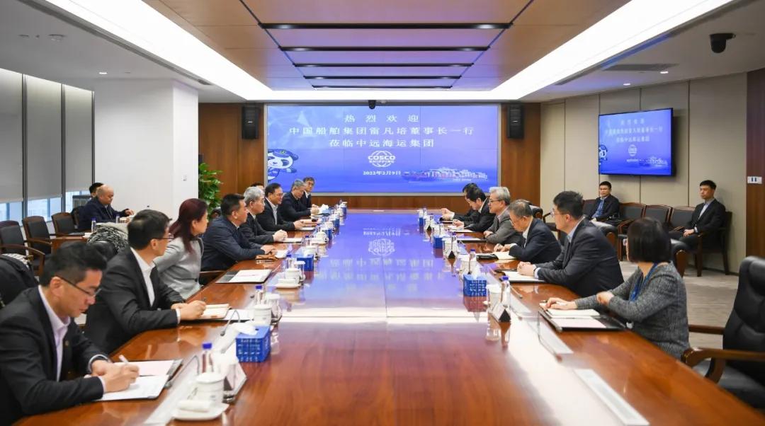 2月9日,中國船舶集團有限公司黨組書記、董事長雷凡培,黨組副書記、總經理楊金成一行赴中遠海運大廈拜會中國遠洋海運集團有限公司黨組書記、董事長萬敏,黨組副書記、總經理付剛峰。雙方互賀壬寅虎年新春,圍繞深入貫徹落實國家重大戰略,就進一步加強綠色燃料技術研發應用、船舶與航運業全產業鏈構建等領域的交流合作,攜手推動我國航運業和造船業高質量發展進行了深入探討并達成廣泛共識。中國船舶集團黨組成員、副總經理孫偉、盛紀綱,中遠海運集團黨組成員、副總經理、總會計師孫云飛參加會談。