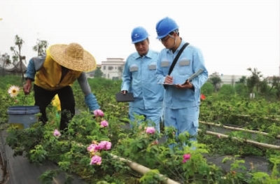 南方電網廣東中山小欖供電局員工向花農宣傳安全用電知識