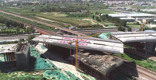 ????該工程上跨鄭焦城際、京廣鐵路等3條線5股道,每天有140對高鐵列車和貨運列車擦肩而過,轉體橋與鐵路線的最近距離只有8.7米,加上該工程橋梁全長317米,寬38.7米,轉體懸臂長71.75米,單側轉體橋梁重達3萬噸,鐵路東、西兩側轉體橋梁總重達6萬噸,體量大,風險高,施工難度可想而知。為確保總重量達6萬噸的轉體橋精準對接,重點在于球鉸的制作、安裝,轉體過程中應力應變、位移與線性的實時監測。本次成功應用的轉動體系采用鋼球鉸,由雙瑞特裝設計、制造、安裝及轉體施工,解決了大噸位橋梁轉體裝置超大承載力,靈活轉動的難題。