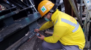 泛廣公司員工在香港大埔運(yùn)動(dòng)場(chǎng)工地檢測(cè)油漆厚度