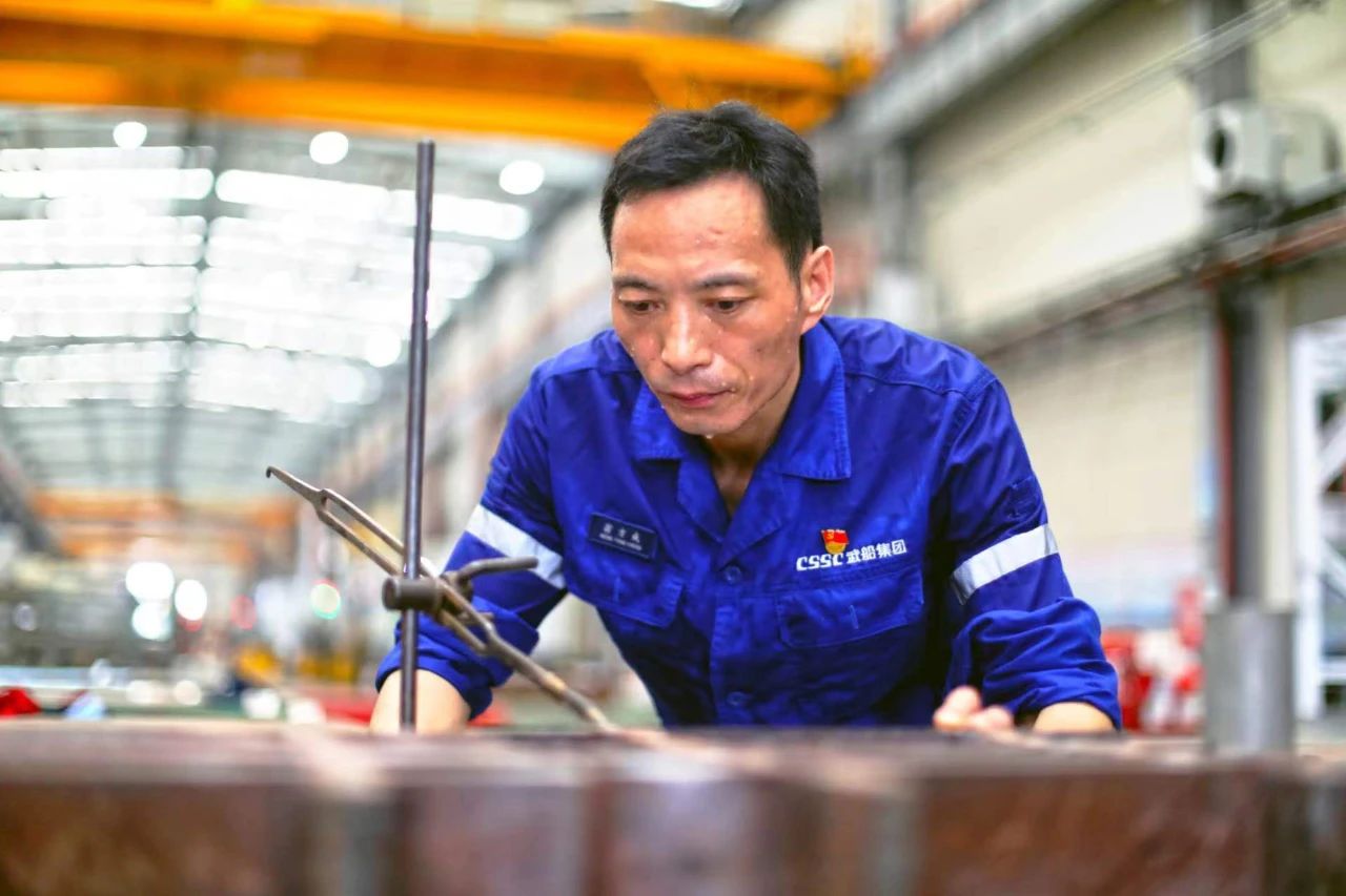 武昌造船——機電事業部劃線鉗工翁方成顧不上滿臉的汗水,全神貫注為水工閘門結構部件劃上機械加工參考線。