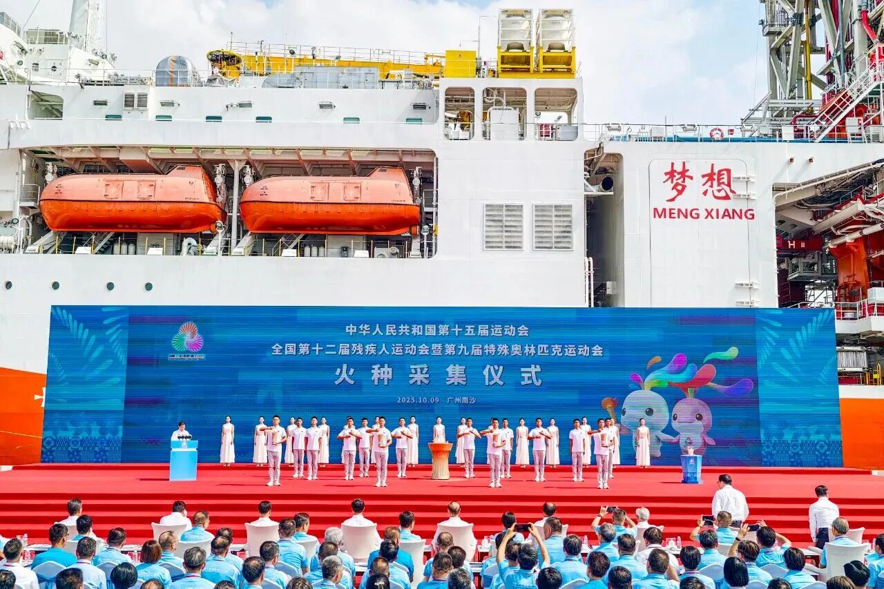 近日,在大洋鉆探船“夢想”號的見證下,第十五屆全國運(yùn)動會和全國第十二屆殘疾人運(yùn)動會暨第九屆特殊奧林匹克運(yùn)動會火種采集儀式在廣州舉行。