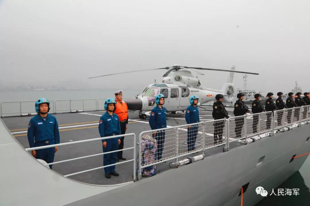 軍樂隊奏響《歡送進行曲》,編隊艦艇依次解纜,緩緩駛離碼頭,任務(wù)官兵整齊列隊、士氣高昂,向祖國和人民揮手告別。