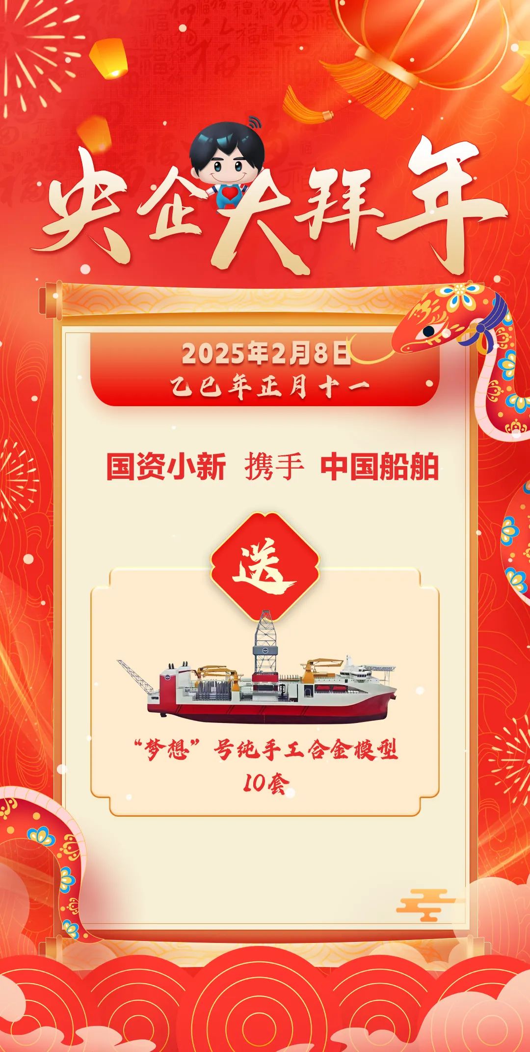 1月25日(臘月二十六)至2月12日(正月十五),“國資小新”攜手19家中央企業(yè)連續(xù)19天在微博平臺為粉絲網(wǎng)友送上新年禮包和新春祝福!